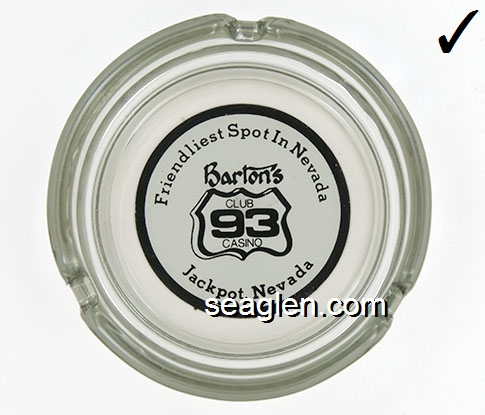 BAC-26 Barton's Club 93 Casino Jackpot, NV 3 1/2" Clear Glass Ashtray Black on white imprint: Friendliest Spot In Nevada, Barton's Club 93 Casino, Fun - Food - Fortune, Jackpot, Nevada |