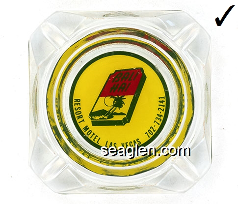 BAH-C2 Bali Hai Motel Las Vegas, NV 3 1/2" Clear Glass Ashtray Green on yellow imprint: Bali Hai, Resort Motel, Las Vegas, 702-734-2141 |