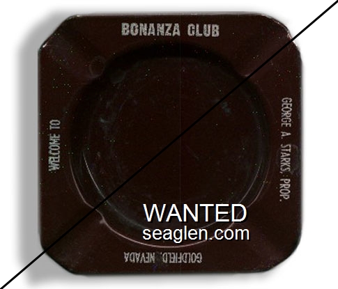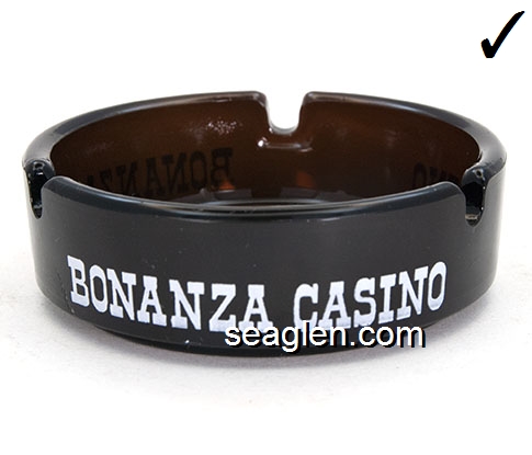 BON-N1 Bonanza Hotel Las Vegas, NV 3 1/2" Smoke Glass Ashtray White and gray imprint: Las Vegas, Bonanza Hotel, Nevada (Like BON-02, except smooth bottom) |
