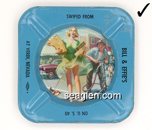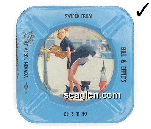 BAL-N1 Bal Tabarin Crystal Bay, NV 4" Brown Metal Ashtray Yellow imprint: Not appearing at Bal Tabarin, On the North Shore of Lake Tahoe, Crystal Bay, Nevada (Top side has nude picture of Marilyn Monroe, bottom side has imprint.) |