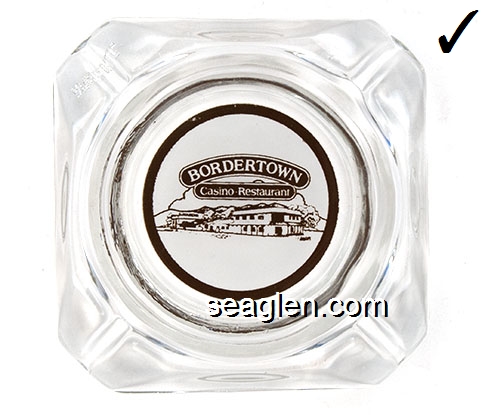 BOR-B4 Bordertown Casino Reno, NV 3 5/8" Clear Glass Ashtray Brown on white imprint: Bordertown Casino - Restaurant (Similar to BOR-08, with different artwork. TAIWAN moulded under one corner.) |