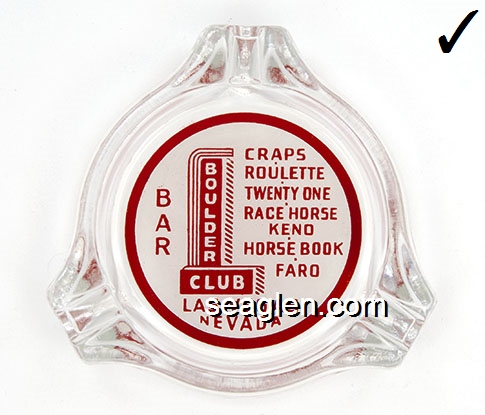 BOU-A1 Boulder Club Las Vegas, NV 3 1/2" Clear Glass Ashtray Red on white imprint: Bar, Craps - Roulette - Twenty One - Race Horse Keno - Horse Book - Faro, Las Vegas Nevada |