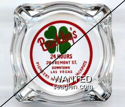 BUC-A1 Buckley's Jackpot Club Las Vegas, NV 3 7/16" Clear Glass Ashtray Red and green on white imprint: Buckley's, 24 Hours, 20 Fremont St., Downtown Las Vegas, Pioneers in Plentiful Jackpots |