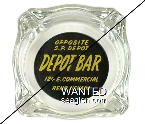 DEP-A2 Depot Club Reno, NV 3 7/16" Clear Glass Ashtray Yellow on black imprint: Opposite S.P. Depot, Depot Bar, 124 E. Commercial, Reno Nevada |