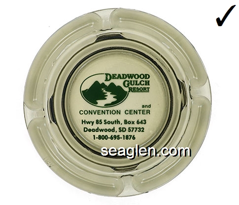 DGR-B1 Deadwood Gulch Resort Deadwood, SD 4 1/2" Smoke Glass Ashtray Green imprint: Deadwood Gulch Resort and Convention Center, Hwy 85 South, Box 643, Deadwood, SD 57732, 1-800-695-1876 |