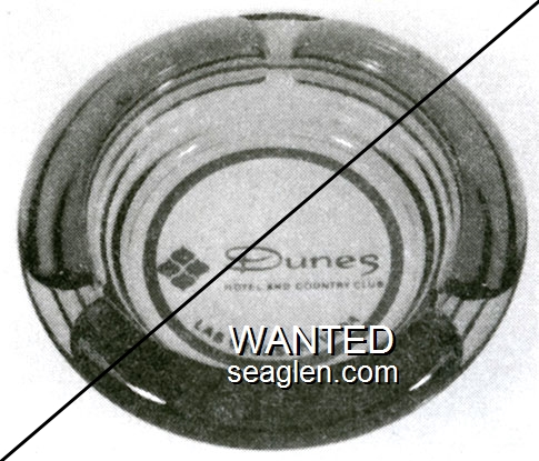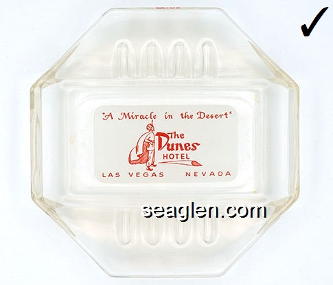 DUN-E2 Dunes Hotel & Country Club Las Vegas, NV 5" Clear Glass Ashtray Red on white imprint: ''A Miracle in the Desert'', The Dunes Hotel, Las Vegas, Nevada |