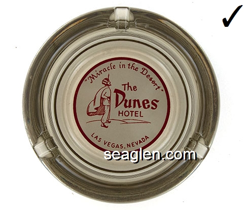 DUN-J1 Dunes Hotel & Country Club Las Vegas, NV 4 1/4" Smoke Glass Ashtray Red on white imprint: ''Miracle in the Desert'', The Dunes Hotel, Las Vegas, Nevada (Like DUN-03, except 4 1/4'', and 1 3/8'' tall) |
