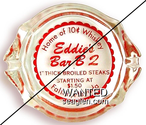 EDA-A1 Eddie's Arcade Fallon, NV 4" Clear Glass Ashtray Red imprint: Home of 10c Whiskey, Eddie's Bar B Q, 1'' Thick Broiled Steaks, Starting at $1.50, Fallon, Nevada |