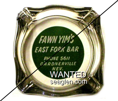 EFH-A1 East Fork Hotel & Bar Gardnerville, NV 3 7/16" Clear Glass Ashtray White on green imprint: Fawn Yim's East Fork Bar, Phone 5611, Gardnerville, Nev. |