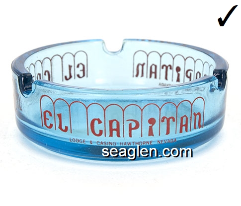 ELC-16 El Capitan Lodge & Casino Hawthorne, NV 3 1/2" Blue Glass Ashtray Red imprint: El Capitan, Lodge & Casino Hawthorne, Nevada |