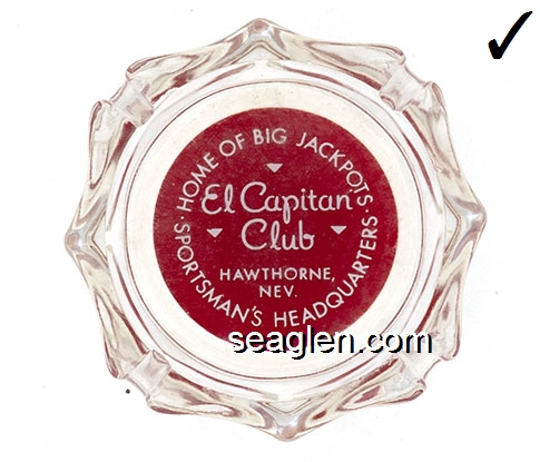 ELC-E1 El Capitan Lodge & Casino Hawthorne, NV 3 11/16" Clear Glass Ashtray White on red imprint: Home of Big Jackpots, El Capitan Club, Hawthorne, Nev., Sportsman's Headquarters (Like ELC-02, except round with four lobes) |