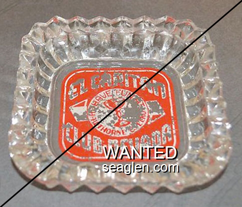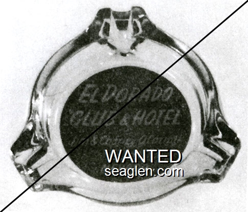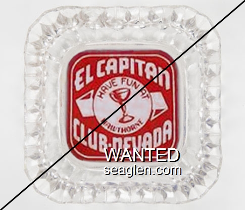ELC-E2 El Capitan Lodge & Casino Hawthorne, NV 3 11/16" Clear Glass Ashtray White on red imprint: Home of Big Jackpots, El Capitan Club, Hawthorne, Nev., Sportsman's Headquarters (Like ELC-02, except imprint not scalloped) |