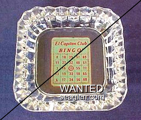 ELC-G3 El Capitan Lodge & Casino Hawthorne, NV 4 1/2" Clear Glass Ashtray Red on green imprint: El Capitan Club, Bingo! |