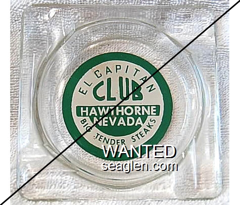 ELC-K1 El Capitan Lodge & Casino Hawthorne, NV 3 1/2" Green Glass Ashtray Red imprint: Barney's New El Capitan Lodge & Casino, Hawthorne, Nevada, 24 ... Sportsman's Headquarters, Hawthorne, Nevada U.S. HWY. 95 (With AAA and Best Western Logos) |