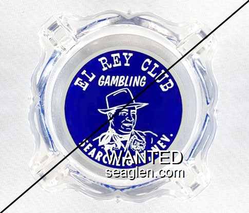 ELR-20 El Rey Club Searchlight, NV 3 11/16" Clear Glass Ashtray White on blue imprint: El Rey Club, Gambling, Phone 0603, Motel, Restaurant, Bar, Open 24 Hrs. Searchlight, Nevada |