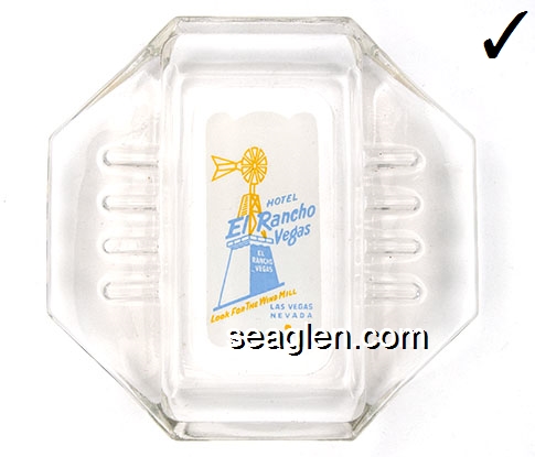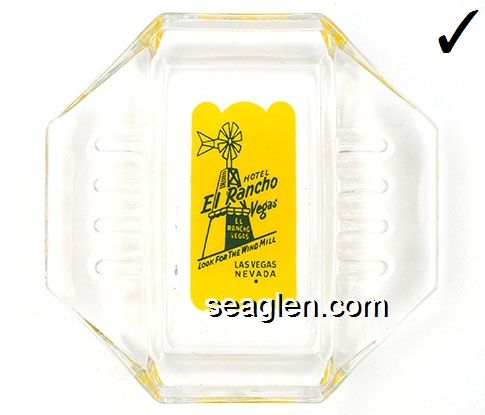 ERV-02 El Rancho Vegas Las Vegas, NV 5" Clear Glass Ashtray Blue on yellow imprint: Hotel El Rancho Vegas, Look For The Wind Mill, Las Vegas, Nevada (SAFEX moulded underside) |