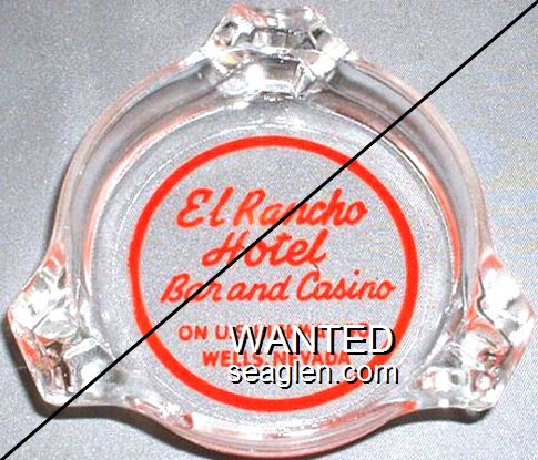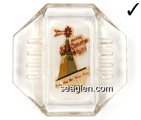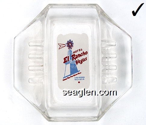 ERV-A1 El Rancho Vegas Las Vegas, NV 5" Clear Glass Ashtray Red and blue on white imprint: Hotel El Rancho Vegas, Look For The Wind Mill, Las Vegas Nevada (SAFEX moulded underside) |