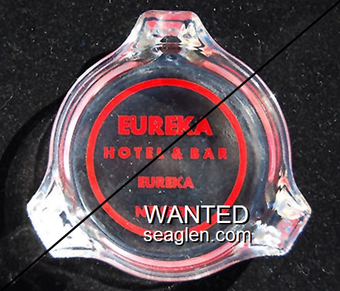 EUH-A1 Eureka Hotel Eureka, NV 4" Clear Glass Ashtray Red imprint: Eureka Hotel Bar & Cafe, Eureka, Nevada, Prop. Lee & Blanche Olinger |