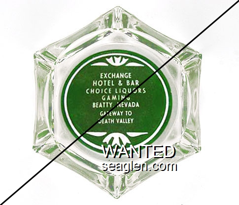 EXC-E1 Exchange Club Beatty, NV 3 1/8" Clear Glass Ashtray White on green imprint: Exchange Hotel & Bar, Choice Liquors, Gaming, Beatty, Nevada, Gateway to Death Valley |