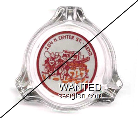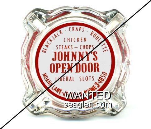 JOD-A1 Johnny's Open Door Reno, NV 3 11/16" Clear Glass Ashtray Red on white imprint: Blackjack - Craps - Roulette, Chicken, Steaks - Chops, Johnny's Open Door, Liberal Slots, Moana Lane - Reno, Nev. - Phone 3-4850 |
