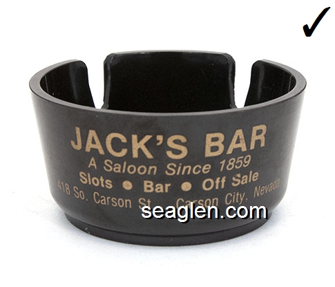 JCK-A1 Jack's Bar Carson City, NV 3" Brown Plastic Ashtray Gold imprint: Jack's Bar, A Saloon Since 1859, Slots - Bar - Off Sale, 418 So. Carson St., Carson City, Nevada |
