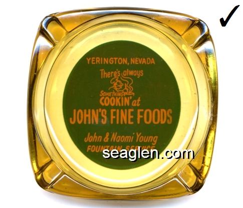 JFF-A1 John's Fine Foods Yerington, NV 3 1/4" Amber Glass Ashtray Orange on green imprint: Yerington, Nevada, There's always Something Cookin' at John's Fine Foods, John & Naomi Young, Fountain Service |