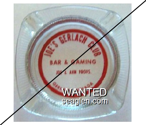 JGC-A2 Joe's Gerlach Club Gerlach, NV 4 1/8" Clear Glass Ashtray Red imprint: Joe's Gerlach Club, Bar & Gaming, Joe & Ann Props., Gerlach, Nevada |