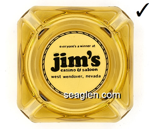 JIM-02 Jim's Casino & Saloon Wendover, NV 3 1/2" Amber Glass Ashtray Black imprint: everyone's a winner at jim's casino & saloon, west wendover, nevada |