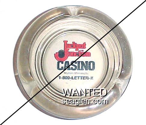 JJU-B1 Jackpot Junction Casino Hotel Morton, MN 4 1/2" Smoke Glass Ashtray Yellow imprint: Jackpot! Junction Casino Hotel, Morton MN, 1-800-WIN-CASH (3 sniffers) |