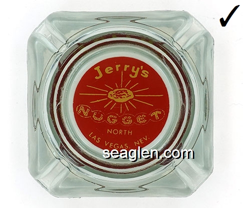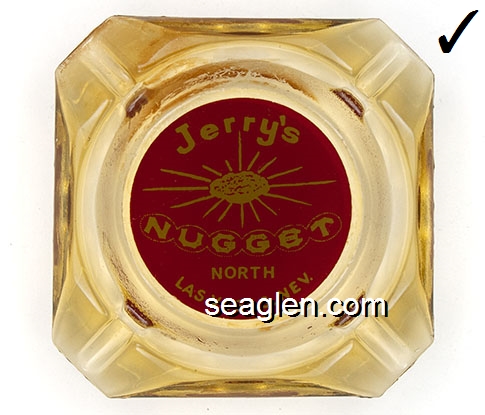 JNC-B1 Jerry's Nugget Casino Las Vegas, NV 3 1/2" Amber Glass Ashtray Gold on red imprint: Jerry's Nugget, North Las Vegas, Nev. (Like JNC-02, except Style A) |