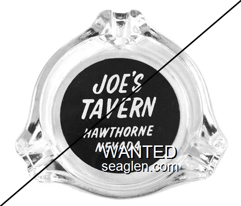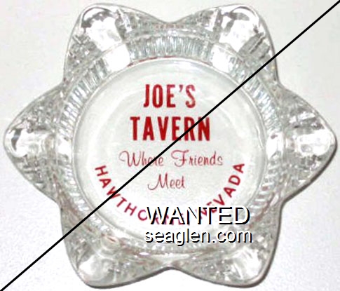 JTV-E1 Joe's Tavern Hawthorne, NV ?" Clear Glass Ashtray Red imprint: Joe's Tavern, Where Friends Meet, Hawthorne, Nevada |