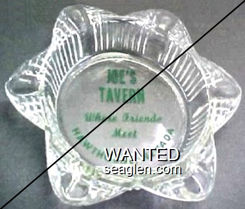 JTV-G1 Joe's Tavern Hawthorne, NV 4 9/16" Clear Glass Ashtray Green imprint: Joe's Tavern, Where Friends Meet, Hawthorne, Nevada (Like JTV-02, except green imprint) |