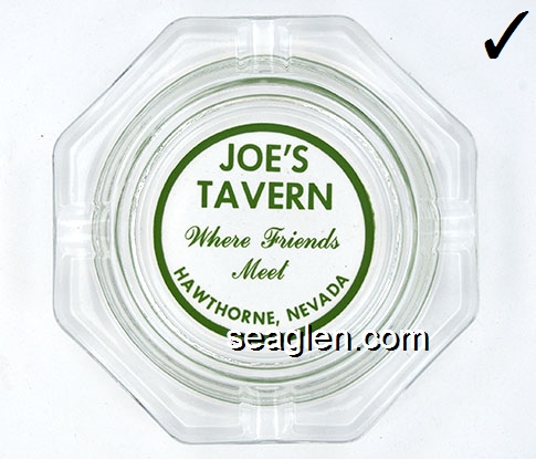 JTV-E2 Joe's Tavern Hawthorne, NV ?" Clear Glass Ashtray Green imprint: Joe's Tavern, Where Friends Meet, Hawthorne, Nevada |
