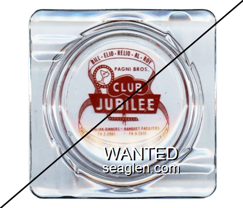 JUB-F1 Jubilee Pleasant Valley, NV 3 3/4" Clear Glass Ashtray Red on white imprint: Bill - Elio - Relio - Al - Roy, Pagni Bros., Club Jubilee, U.S. Hiway 395 Nevada, The Brightest Spot Between Reno & Carson City |