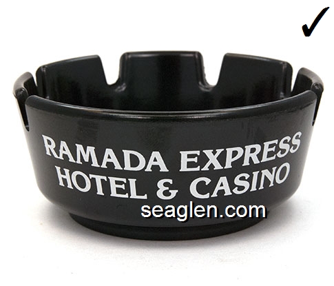 RAE-B1 Ramada Express Laughlin, NV 4" Black Plastic Ashtray White imprint: Ramada Express, Hotel & Casino |