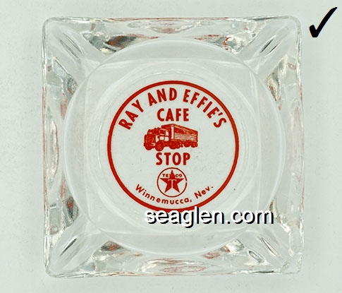 REC-A1 Ray and Effie's Cafe Winnemucca, NV 3 1/2" Clear Glass Ashtray Red imprint: Ray and Effie's Cafe Stop, Texaco, Winnemucca, Nev. |