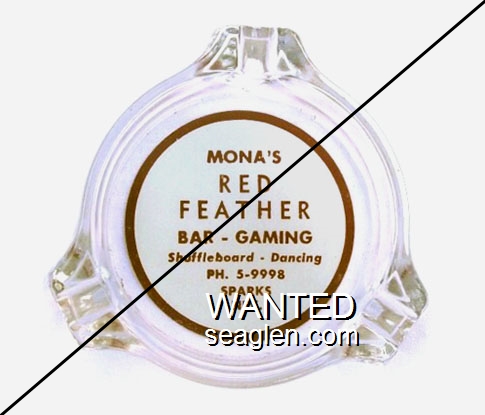 RFB-A1 Red Feather Bar Sparks, NV 3 3/8" Clear Glass Ashtray Red on white imprint: Mona's Red Feather Bar - Gaming, Shuffleboard - Dancing, Ph. 5-9998, Sparks, Nev. |
