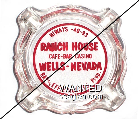RHC-A4 Ranch House Casino Wells, NV 3 1/2" Clear Glass Ashtray Red on white imprint: Ranch House, Wells, Nevada, Highway U.S. 40 |
