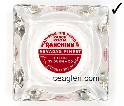 RIN-04 RanchInn Elko, NV 3 5/8" Clear Glass Ashtray Red and white imprint: Featuring the Popular Ranch Room, Ranch Inn, Nevada's Finest, Home of the Famous ''Lounge'', Commercial Hotel |