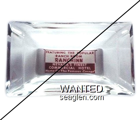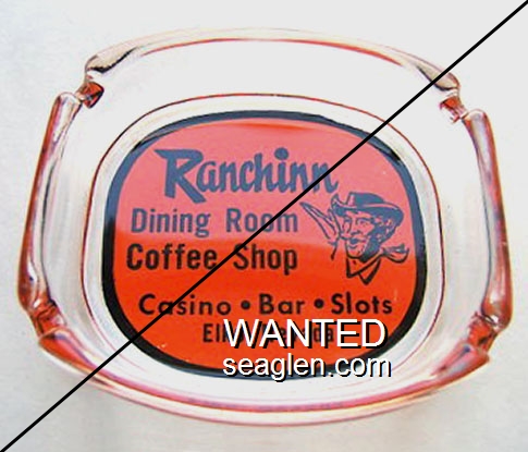 RIN-A1 RanchInn Elko, NV 3 x 5" Clear Glass Ashtray Red and white imprint: Featuring The Popular Ranch Room, RanchInn, Nevada's Finest Commercial Hotel, Home of the Famous ''Lounge'' |