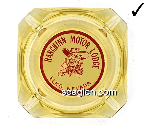 RIN-D1 RanchInn Elko, NV 3 1/2" Amber Glass Ashtray Red on white imprint: Ranch Inn Motor Lodge, Elko, Nevada |