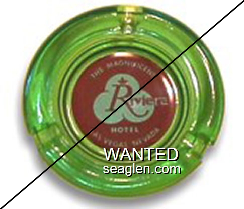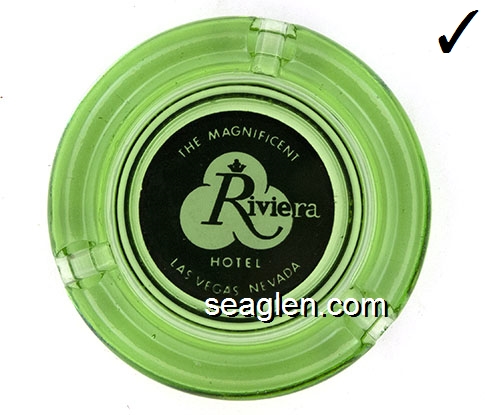 RIV-B7 Riviera Hotel Las Vegas, NV 4" Green Glass Ashtray Red on white imprint: The Magnificent Riviera Hotel, Las Vegas, Nevada (Straight sniffers) |