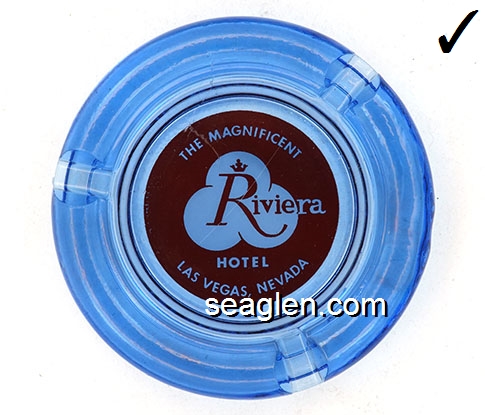 RIV-D3 Riviera Hotel Las Vegas, NV 4" Blue Glass Ashtray Red on white imprint: The Magnificent Riviera Hotel, Las Vegas, Nevada (Rounded sniffers) |