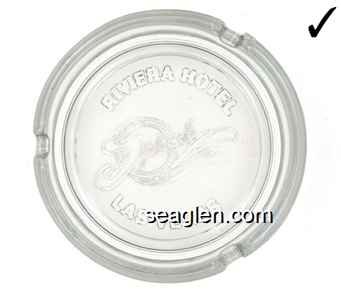RIV-J2 Riviera Hotel Las Vegas, NV 4 1/2" Clear Glass Ashtray Molded imprint: Riviera Hotel & Casino, Las Vegas (Like RIV-14, except clear color. USA moulded under side) |