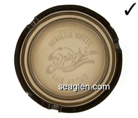 RIV-A2 Riviera Hotel Las Vegas, NV 3 5/8" Smoke Glass Ashtray White imprint: Riviera Las Vegas, Splash ... An Aquacade of Music & Dance, An Evening at La Cage (Like RIV-07, except smoke glass with white imprint) |