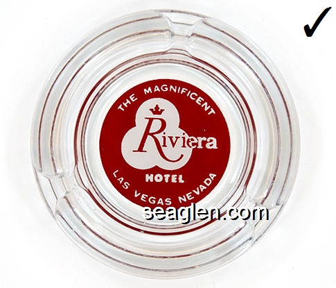 RIV-04 Riviera Hotel Las Vegas, NV 4" Smoke Glass Ashtray Red and white imprint: The Magnificent Riviera Hotel, Las Vegas, Nevada |