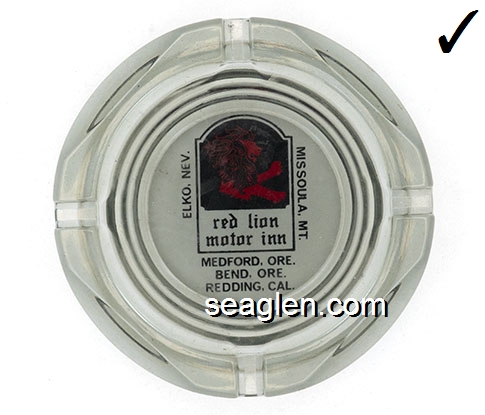 RLM-A3 Red Lion Motor Inn Elko, NV 4 1/2" Smoke Glass Ashtray Red and black on white imprint: Red Lion Motor Inn, Elko, Nev., Missoula, Mt., Medford, Ore., Bend, Ore., Redding, Cal. |