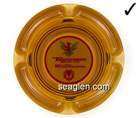 RLM-B1 Red Lion Motor Inn Elko, NV 4 1/2" Amber Glass Ashtray Red and green on white imprint: Thunderbird Motor Inns, Red Lion Motor Inns |