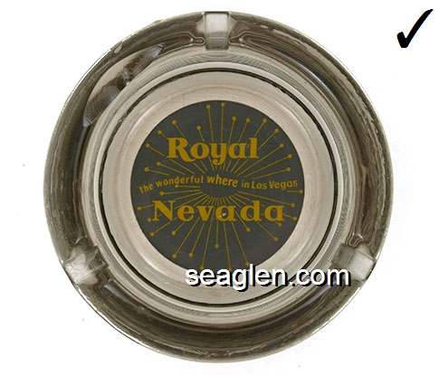 RNV-A4 Royal Nevada Las Vegas, NV 4" Smoke Glass Ashtray Yellow on gray imprint: Royal Nevada, The Wonderful Where in Las Vegas (7/8'' tall, Small imprint, wide border) |