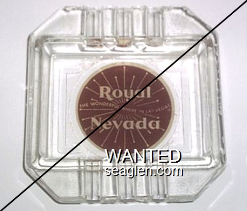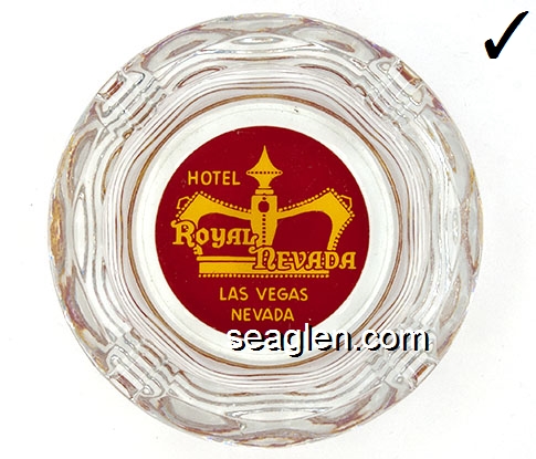 RNV-A1 Royal Nevada Las Vegas, NV 4" Smoke Glass Ashtray White on red imprint: Royal Nevada, The Wonderful Where in Las Vegas (Like RNV-01, except with white on red imprint; thin border) |